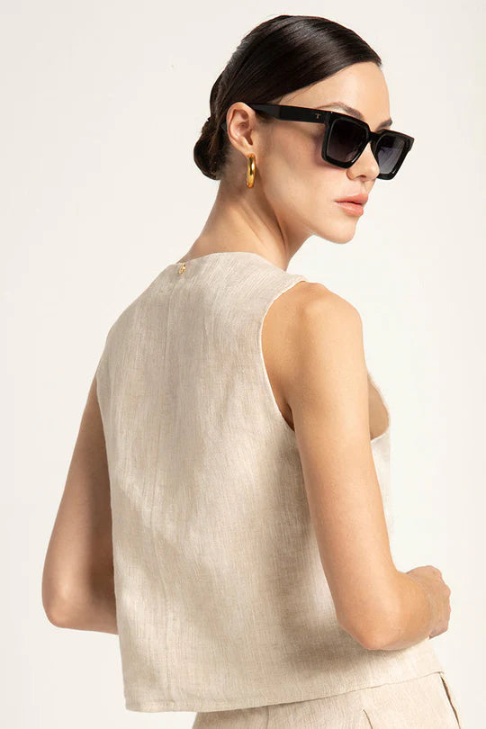 Chaleco en jacquard de lino con tapas de bolsillo y cierre con botón Color Caqui, Ref. 0A54041